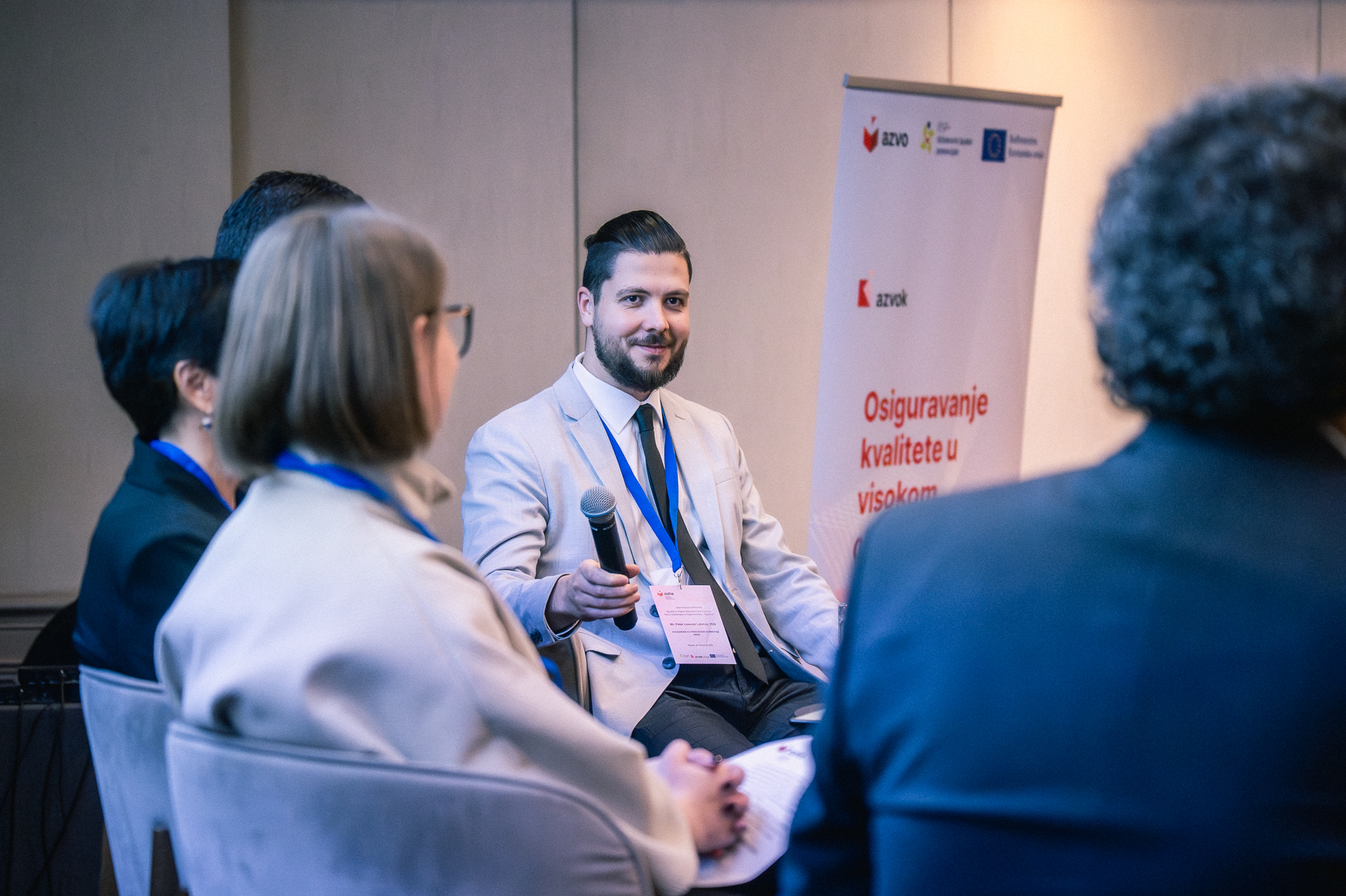 The conference’s first panel, titled “Quality as a Common Language of European Education and Science”, was moderated by Prof. Olgun Cicek, PhD, an international quality assurance expert from the University of Ljubljana, and brought together both international and domestic experts: Dr. Péter Levente Lakatos, PhD, Director of the Hungarian Accreditation Committee (MAB), Naim Gashi, Director of the Kosovo Accreditation Agency (KAA), Prof. Anita Pavić Pintarić, PhD, Vice-Rector of the University of Zadar, and Lana Par, President of the ESU. The panellists discussed the role of the ESG as the foundation of trust, cooperation, and mutual recognition within the European Higher Education Area, as well as the challenges faced by higher education institutions in their implementation and student expectations.